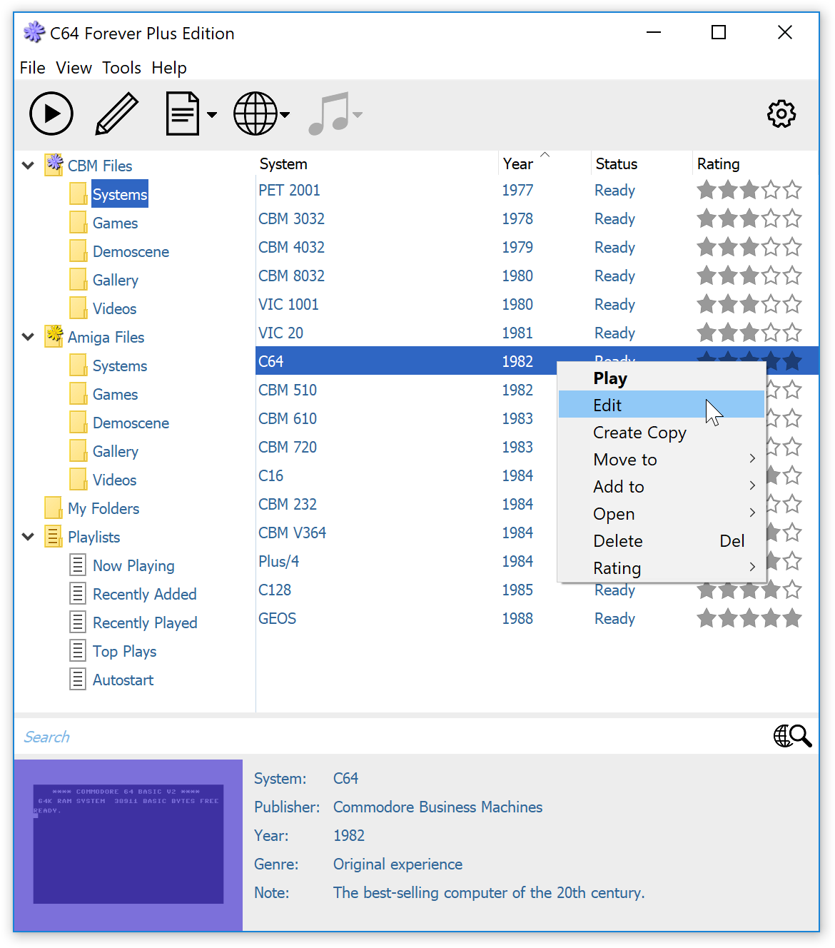 Familiar player controls help make content easily accessible, while advanced title authoring features are just a click away. In this instance, the player detected that Amiga Forever is also installed, and included its content (optional "merge platforms" feature).